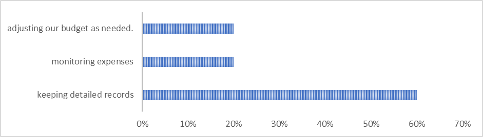 The implementation of financial strategies highlighted a predominant emphasis on meticulous record-keeping, with 60% showcasing a commitment to financial prudence. An additional 20% each expressed a commitment to monitoring expenses and adjusting budgets as needed.