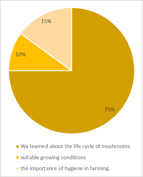 The analysis of responses from 287 participants in the "Grow with Shrooms" initiative reveals a significant impact on knowledge acquisition and community engagement. Among them, 215 (75%) demonstrated a solid understanding of the fundamental mushroom life cycle, while 29 (10%) recognized suitable growing conditions, and 43 (15%) grasped the importance of hygiene.