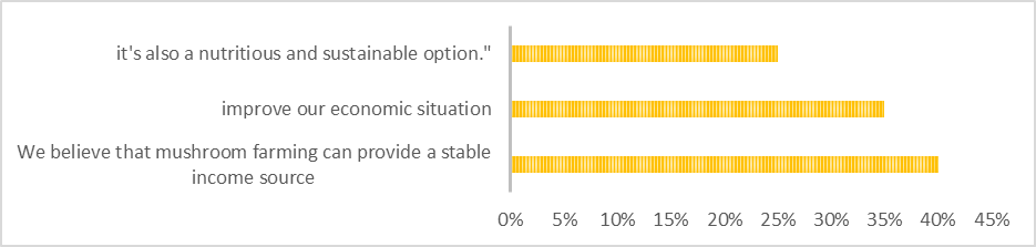 In terms of the economic impact, 40% acknowledged mushroom farming as a stable income source, aligning with the initiative's economic empowerment goals. Another 35% foresaw an improvement in their economic situation, while 25% recognized the nutritional and sustainable benefits of mushroom farming.