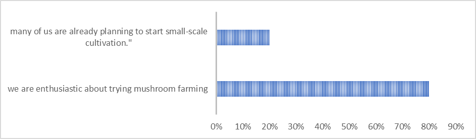 A significant 80% of participants expressed enthusiasm about trying mushroom farming, indicating a positive disposition towards practical application. Additionally, 20% were already planning small-scale cultivation, signaling tangible initiatives within the community sparked by the initiative.