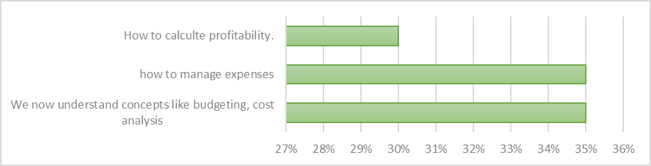 Regarding financial literacy, participants exhibited a balanced understanding, with 35% comprehending budgeting and cost analysis, another 35% understanding the importance of managing expenses, and 30% grasping the intricacies of calculating profitability.